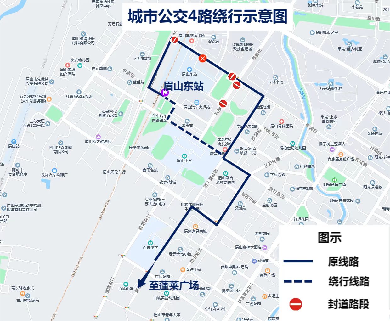 (一)公交4路:眉山東站出發(fā),繞行紫竹中街后原線路運(yùn)行(往返繞行)。